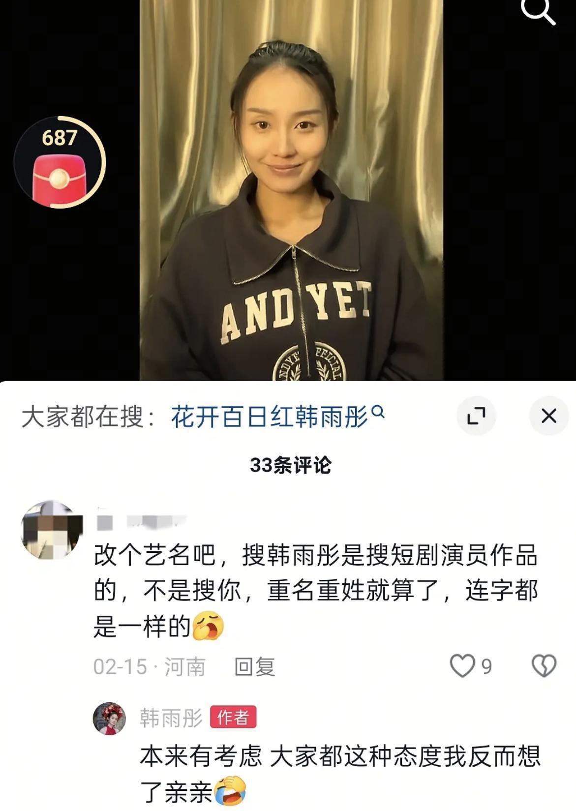 你再横向对比一下那些靠颜值撑着讲台词的同期短剧演员,高下立现。然后是那个“名字保卫战”。2026年初,有个叫韩雨彤的新人演员,因为跟顶流撞了名,被顶流粉丝围着骂,让她改名。新人回了句“看心情吧”,激化矛盾。这事儿里,顶流韩雨彤本人一个字都没发。